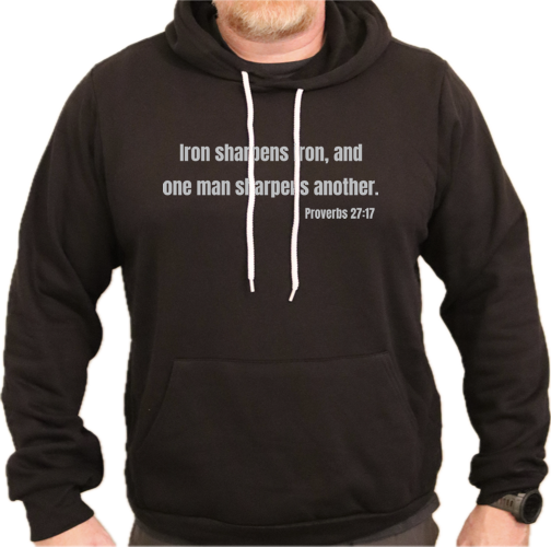 Proverbs 27:17 “Iron Sharpens Iron, and one man sharpens another”. hooded sweatshirt.